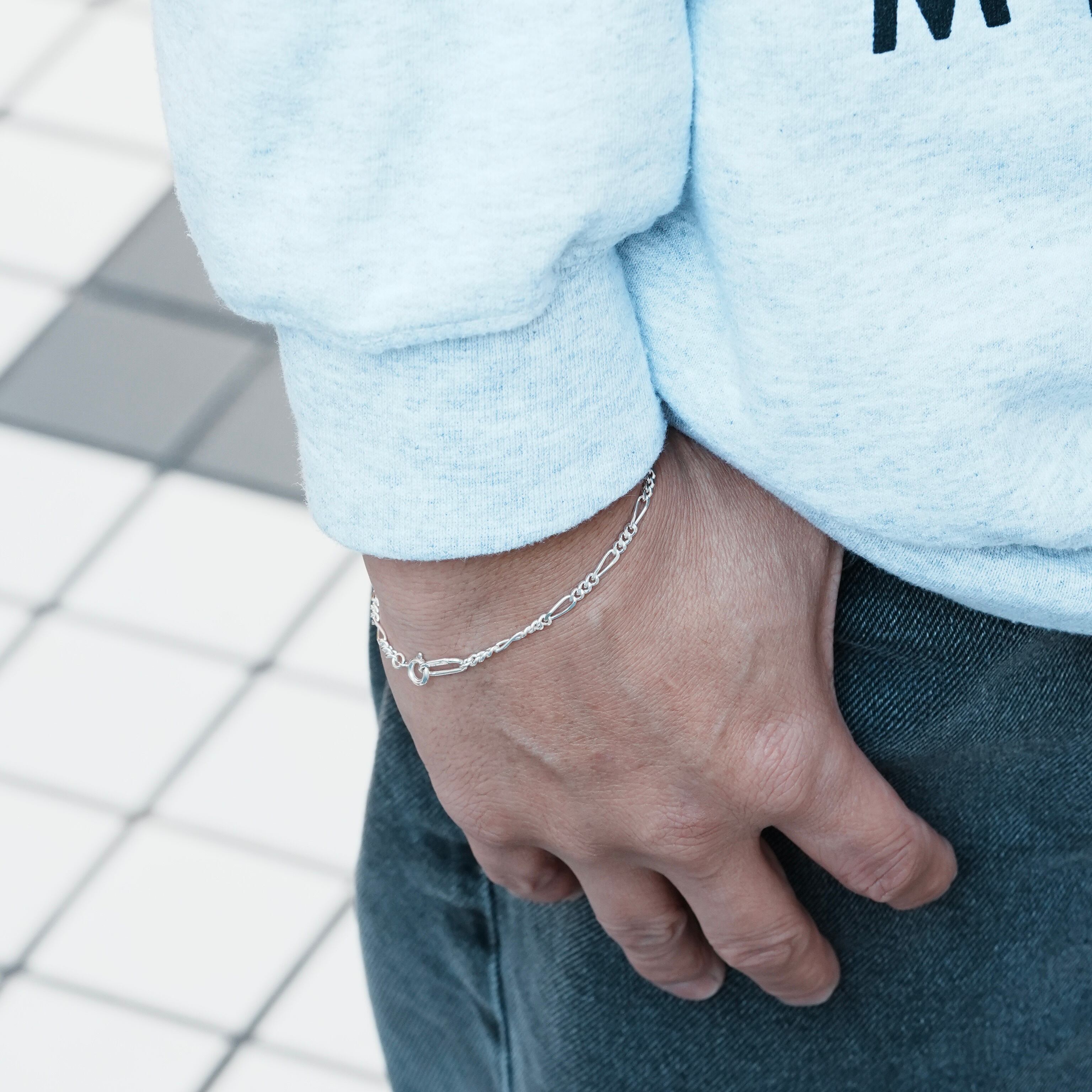 フィガロチェーンとは、大きさや形が異なる輪を交互に連結したチェーン。あずきチェーンや喜平チェーンと異なり、異なる輪のデザインがアクセントとなり、洗練された印象を与えます。